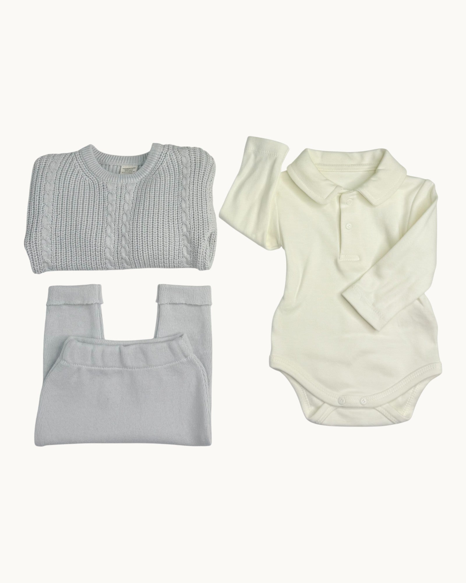 - 3-piece set: cable knit sweater + matching pants + long-sleeve polo bodysuit